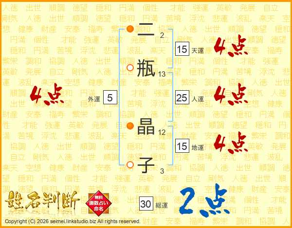 二(2画)瓶(13画) 晶(12画)子(3画)