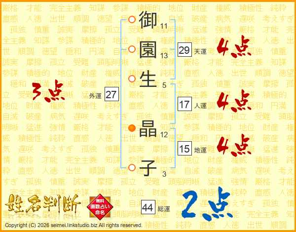御(11画)園(13画)生(5画) 晶(12画)子(3画)