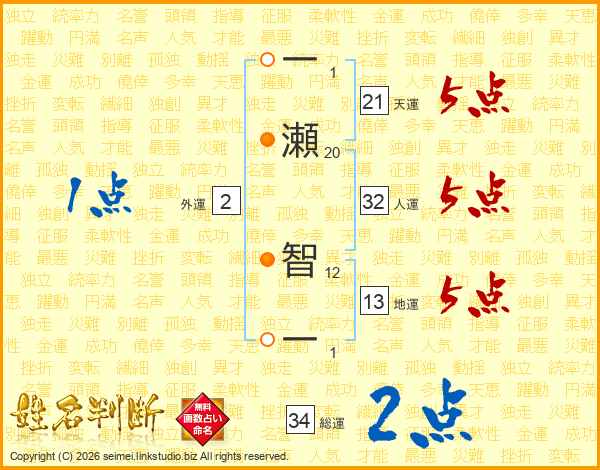 生活面を象徴する運勢です。外部から受ける影響力を表し、結婚運、家庭運や職場、環境への順応性を表します。総運から人運を引いた画数。姓や名が1文字の場合を除く。