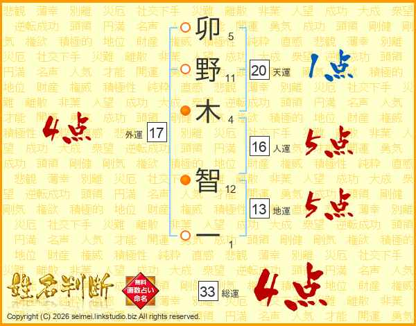 卯野木智一さんの総運は33画の4点!