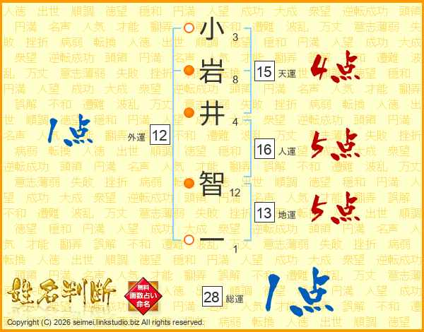 小(3画)岩(8画)井(4画) 智(12画)一(1画)