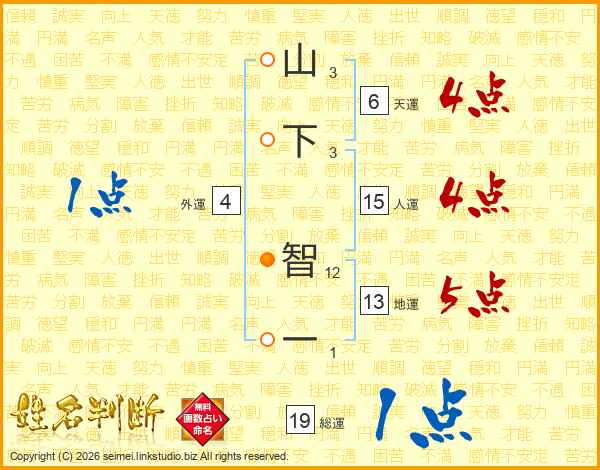 生活面を象徴する運勢です。外部から受ける影響力を表し、結婚運、家庭運や職場、環境への順応性を表します。総運から人運を引いた画数。姓や名が1文字の場合を除く。