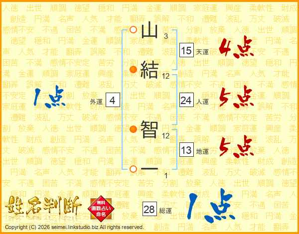 生活面を象徴する運勢です。外部から受ける影響力を表し、結婚運、家庭運や職場、環境への順応性を表します。総運から人運を引いた画数。姓や名が1文字の場合を除く。