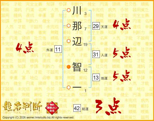 川(3画)那(7画)辺(19画) 智(12画)一(1画)