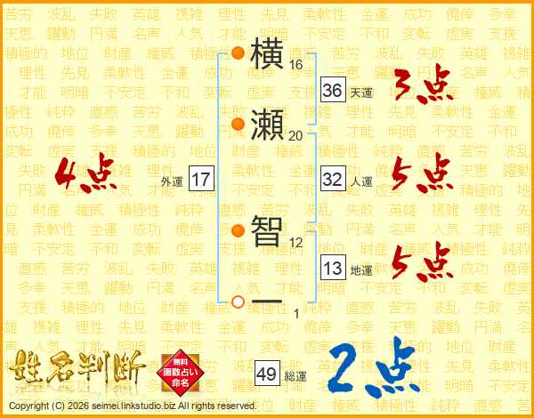 生活面を象徴する運勢です。外部から受ける影響力を表し、結婚運、家庭運や職場、環境への順応性を表します。総運から人運を引いた画数。姓や名が1文字の場合を除く。