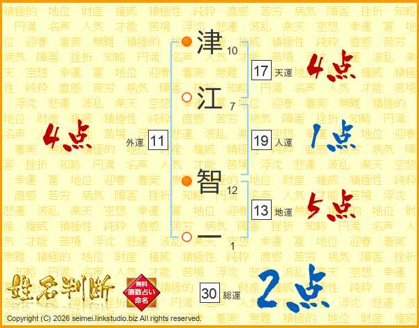 生活面を象徴する運勢です。外部から受ける影響力を表し、結婚運、家庭運や職場、環境への順応性を表します。総運から人運を引いた画数。姓や名が1文字の場合を除く。