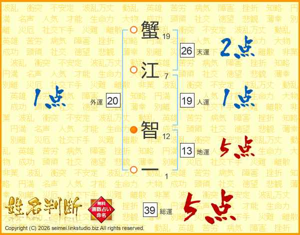生活面を象徴する運勢です。外部から受ける影響力を表し、結婚運、家庭運や職場、環境への順応性を表します。総運から人運を引いた画数。姓や名が1文字の場合を除く。