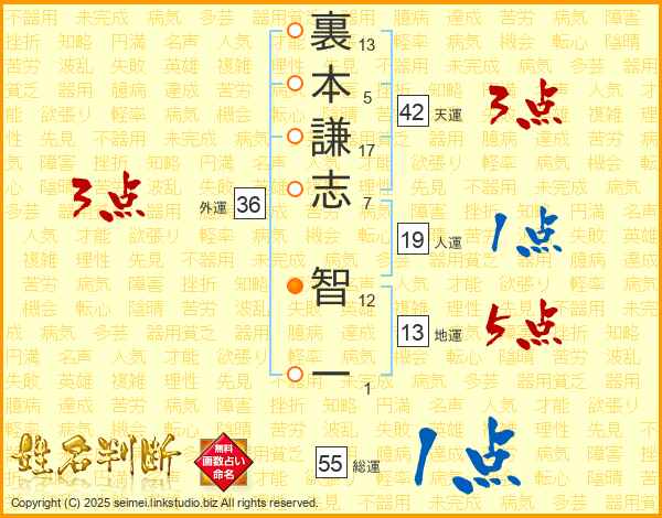 裏(13画)本(5画)謙(17画)志(7画) 智(12画)一(1画)