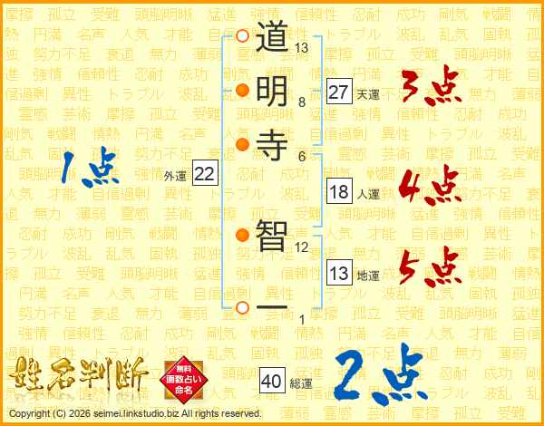 道(13画)明(8画)寺(6画) 智(12画)一(1画)