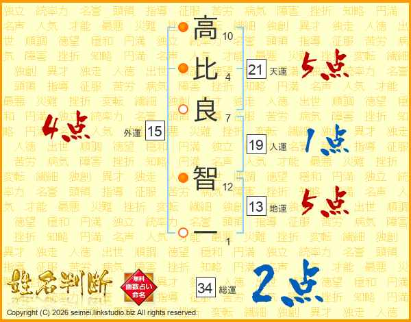 高(10画)比(4画)良(7画) 智(12画)一(1画)