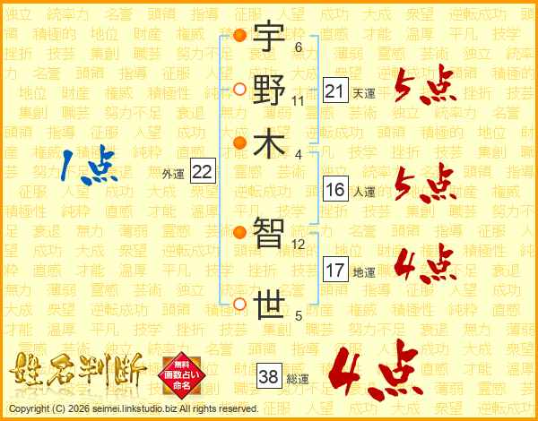 宇(6画)野(11画)木(4画) 智(12画)世(5画)