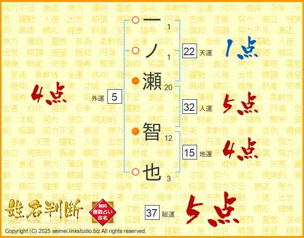 一(1画)ノ(1画)瀬(20画) 智(12画)也(3画)