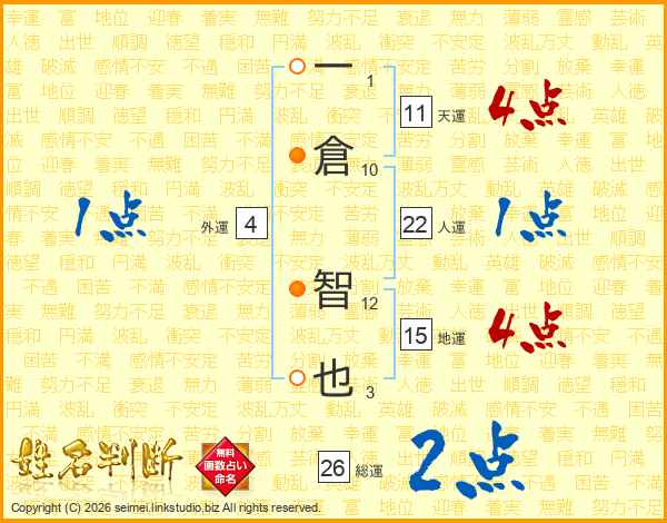 生活面を象徴する運勢です。外部から受ける影響力を表し、結婚運、家庭運や職場、環境への順応性を表します。総運から人運を引いた画数。姓や名が1文字の場合を除く。