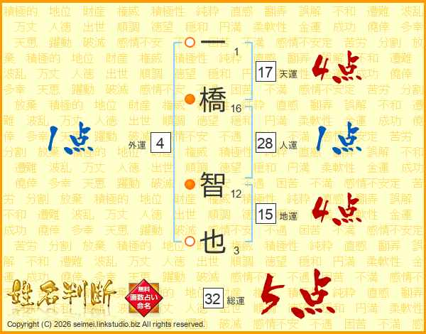 あなたの人生を表す1番重要な運勢です。生涯を通じて影響する総合運となり、主に50歳以降の晩年期に影響を及ぼします。苗字と名前の合計画数。