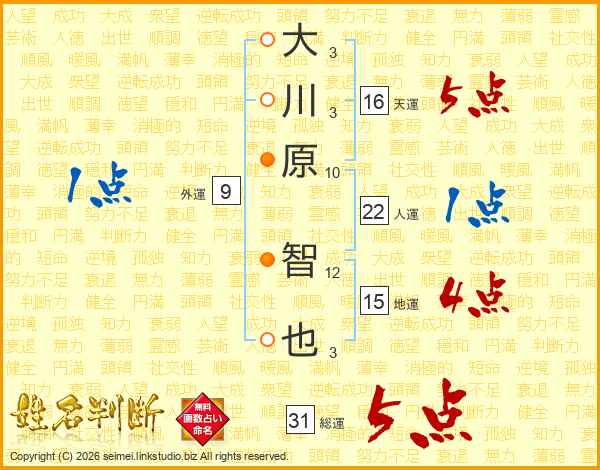 大(3画)川(3画)原(10画) 智(12画)也(3画)