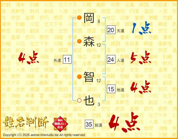 生活面を象徴する運勢です。外部から受ける影響力を表し、結婚運、家庭運や職場、環境への順応性を表します。総運から人運を引いた画数。姓や名が1文字の場合を除く。
