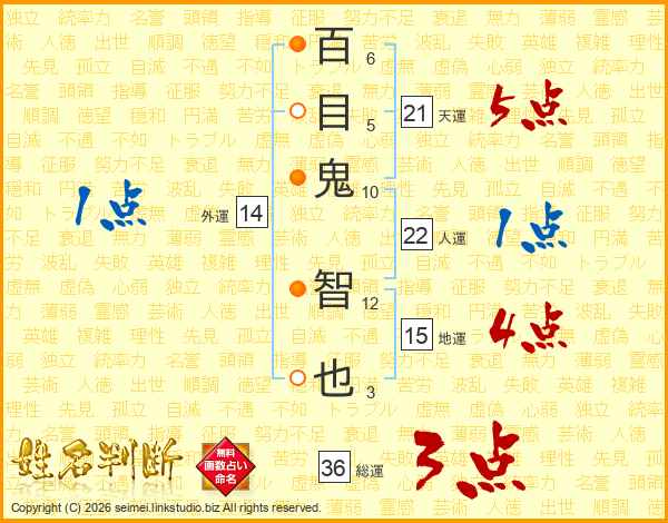 百(6画)目(5画)鬼(10画) 智(12画)也(3画)