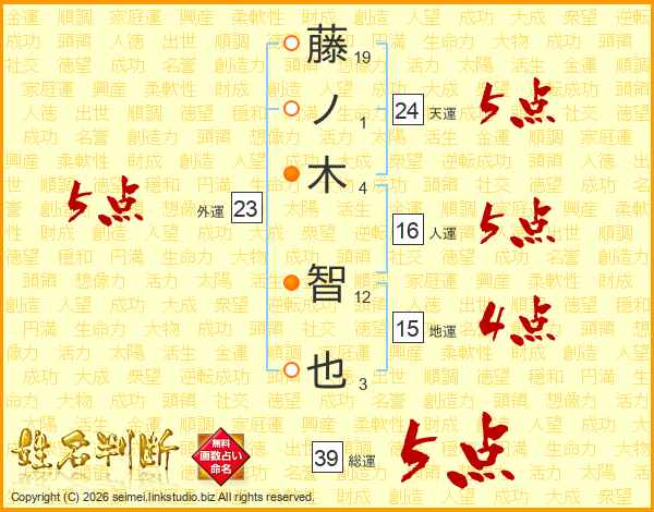 藤(19画)ノ(1画)木(4画) 智(12画)也(3画)