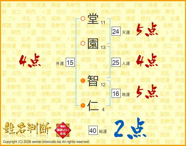 堂(11画)園(13画) 智(12画)仁(4画)