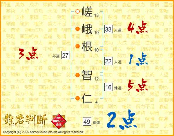 嵯峨根智仁さんの天運は33画の4点!