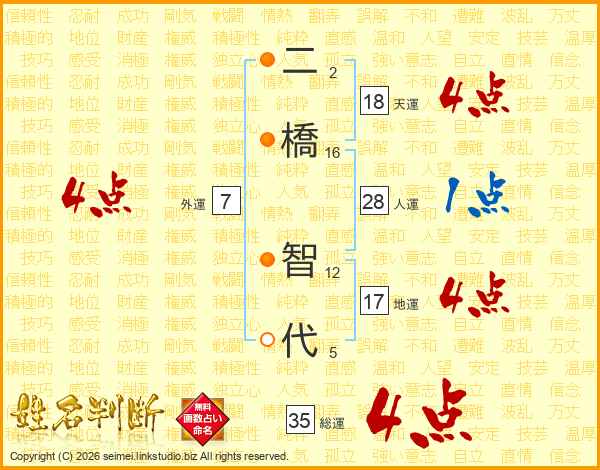 家系が持つ宿命的な運勢を表します。祖先から受け継いだ苗字ですので自分の力が及びません。家柄を象徴します。苗字の合計画数。