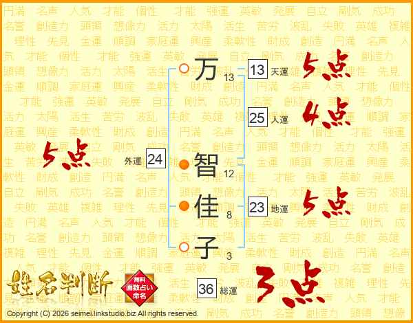 万(13画) 智(12画)佳(8画)子(3画)