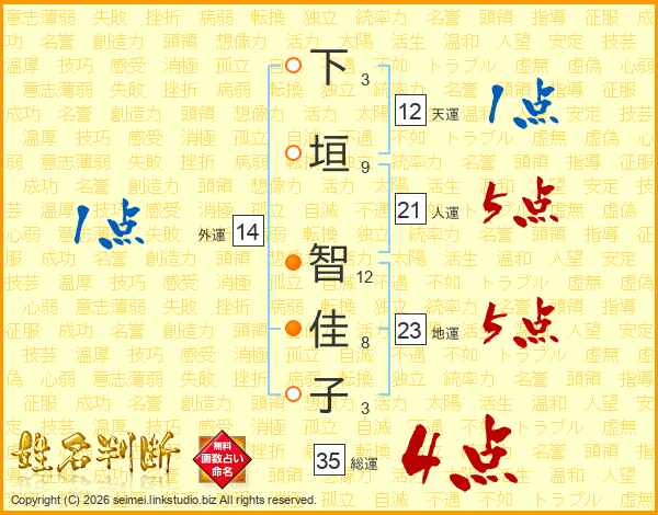 下(3画)垣(9画) 智(12画)佳(8画)子(3画)