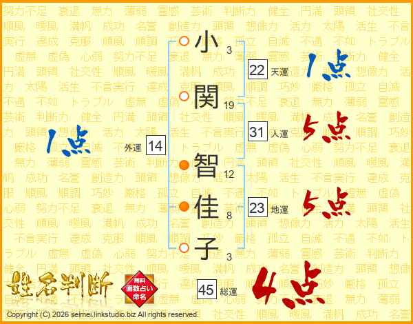 小(3画)関(19画) 智(12画)佳(8画)子(3画)