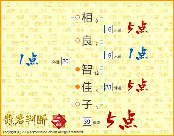 相(9画)良(7画) 智(12画)佳(8画)子(3画)