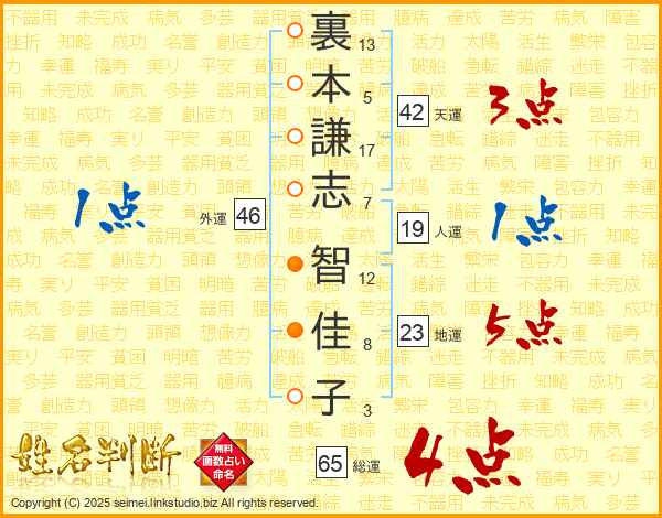 裏(13画)本(5画)謙(17画)志(7画) 智(12画)佳(8画)子(3画)