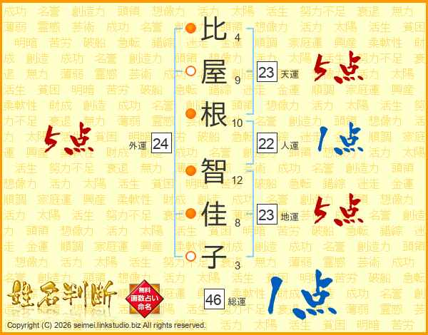比(4画)屋(9画)根(10画) 智(12画)佳(8画)子(3画)