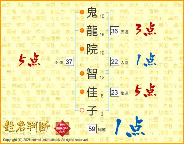 鬼(10画)龍(16画)院(10画) 智(12画)佳(8画)子(3画)