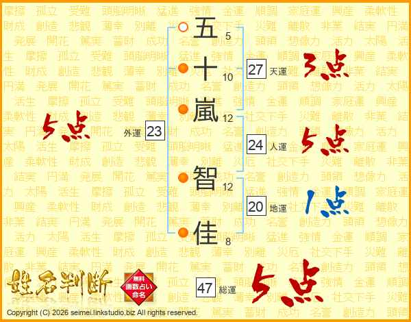 五(5画)十(10画)嵐(12画) 智(12画)佳(8画)