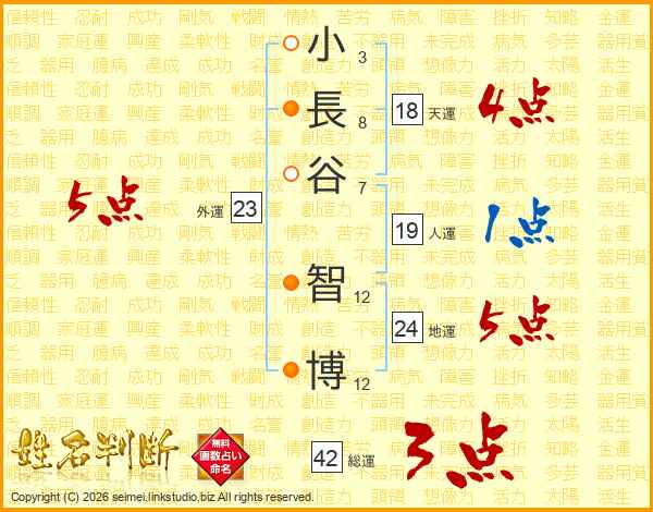 小(3画)長(8画)谷(7画) 智(12画)博(12画)