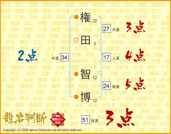 権(22画)田(5画) 智(12画)博(12画)
