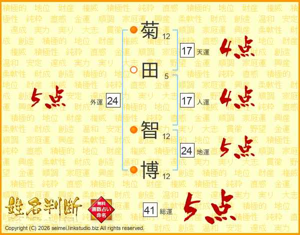 生活面を象徴する運勢です。外部から受ける影響力を表し、結婚運、家庭運や職場、環境への順応性を表します。総運から人運を引いた画数。姓や名が1文字の場合を除く。
