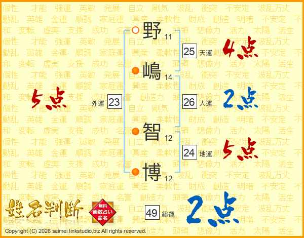 あなたの人生を表す1番重要な運勢です。生涯を通じて影響する総合運となり、主に50歳以降の晩年期に影響を及ぼします。苗字と名前の合計画数。