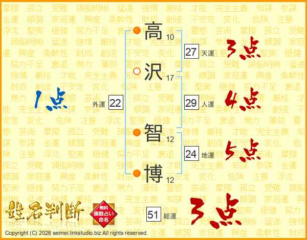 生活面を象徴する運勢です。外部から受ける影響力を表し、結婚運、家庭運や職場、環境への順応性を表します。総運から人運を引いた画数。姓や名が1文字の場合を除く。
