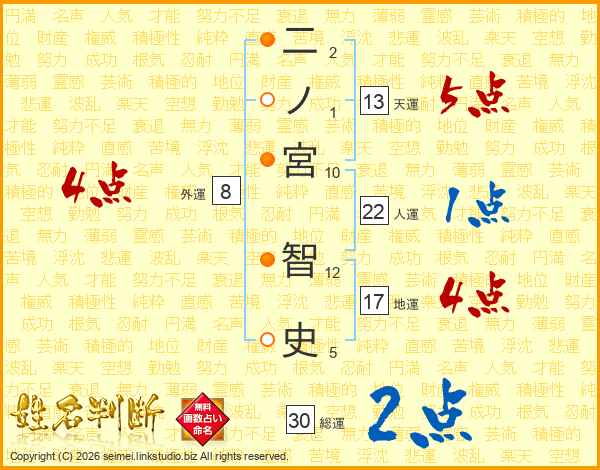 二ノ宮智史さんの総運は30画の2点!