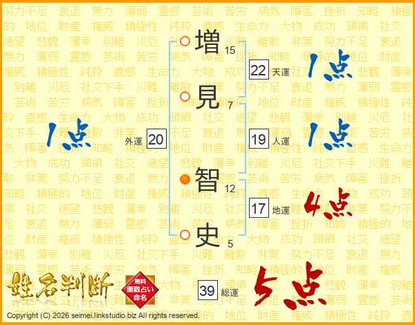 増(15画)見(7画) 智(12画)史(5画)