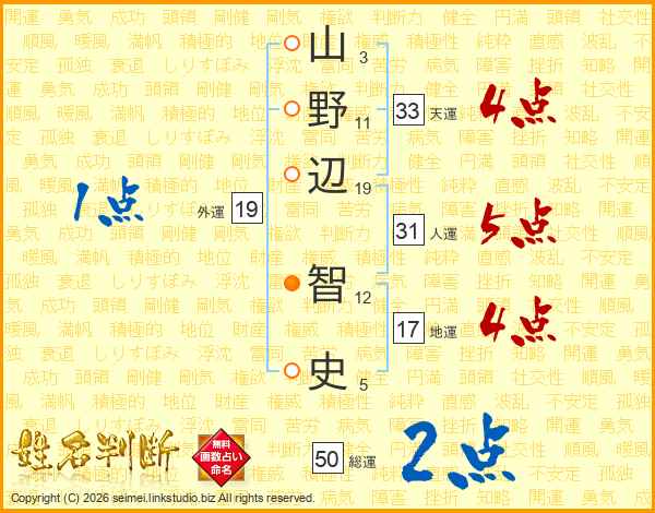 山(3画)野(11画)辺(19画) 智(12画)史(5画)
