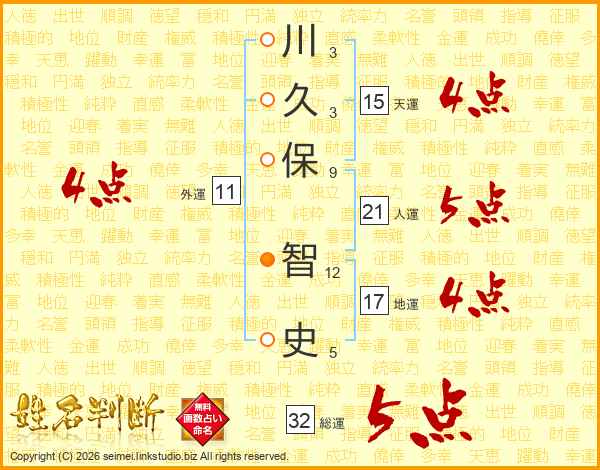 川久保智史さんの総運は32画の5点!