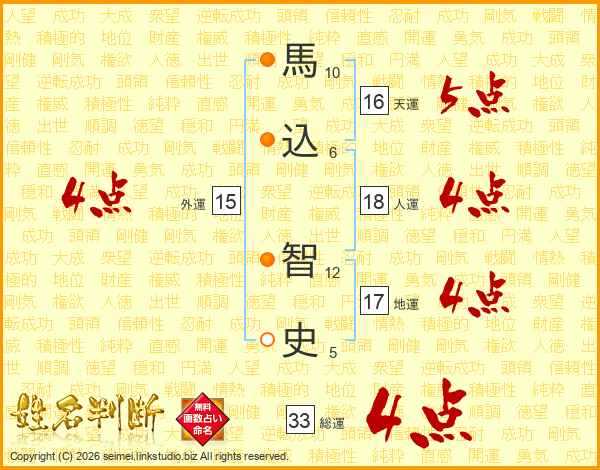 生活面を象徴する運勢です。外部から受ける影響力を表し、結婚運、家庭運や職場、環境への順応性を表します。総運から人運を引いた画数。姓や名が1文字の場合を除く。
