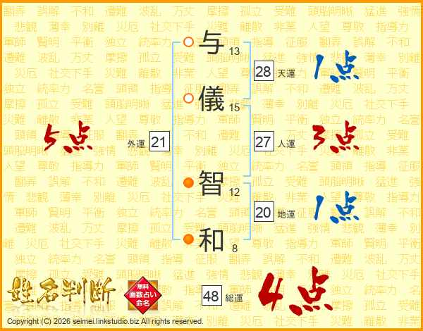 生活面を象徴する運勢です。外部から受ける影響力を表し、結婚運、家庭運や職場、環境への順応性を表します。総運から人運を引いた画数。姓や名が1文字の場合を除く。