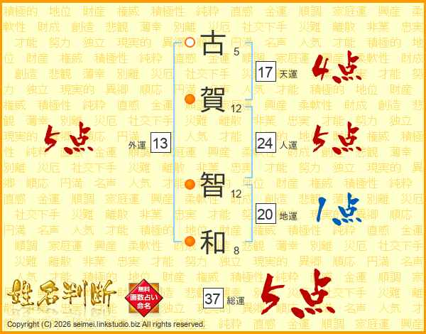 古(5画)賀(12画) 智(12画)和(8画)