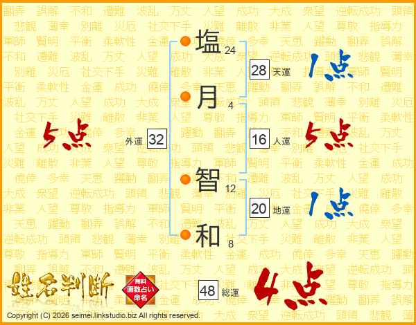 生活面を象徴する運勢です。外部から受ける影響力を表し、結婚運、家庭運や職場、環境への順応性を表します。総運から人運を引いた画数。姓や名が1文字の場合を除く。