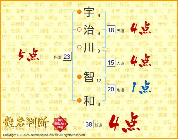 宇(6画)治(9画)川(3画) 智(12画)和(8画)