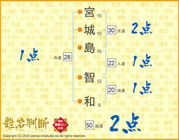 宮(10画)城(10画)島(10画) 智(12画)和(8画)