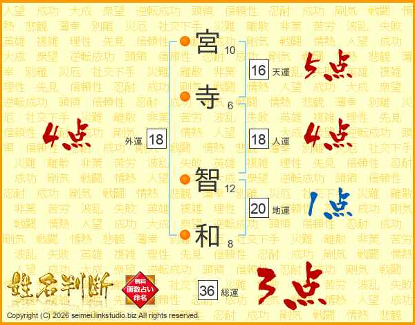 宮(10画)寺(6画) 智(12画)和(8画)