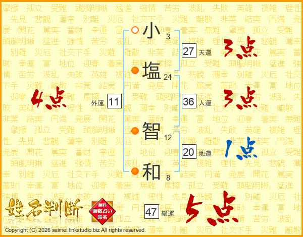 生活面を象徴する運勢です。外部から受ける影響力を表し、結婚運、家庭運や職場、環境への順応性を表します。総運から人運を引いた画数。姓や名が1文字の場合を除く。